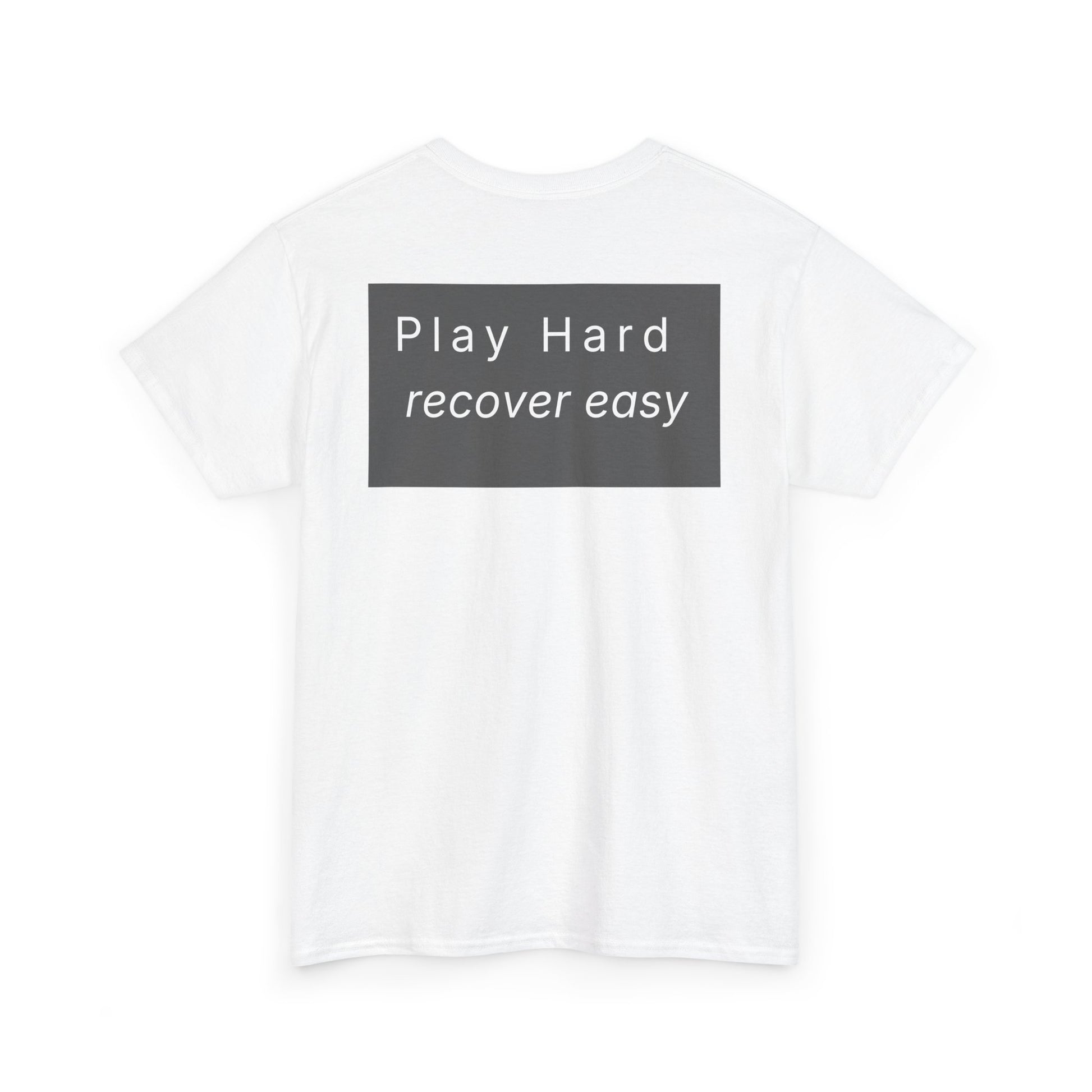 This soft, breathable tee carries a quiet confidence — a clean chest patch and a bold back message reading "Play Hard / recover easy." It feels like the shirt you reach for after a long session at the gym, a weekend of trail runs, or a late-night shift when you want comfort that speaks your values. The medium-weight cotton sits comfortably against the skin, the ribbed collar holds its shape, and the tear-away label keeps movement irritation-free. Wear it when you push limits and then press pause to recalibrate; the understated design pairs easily with shorts, joggers, or your favorite jeans.